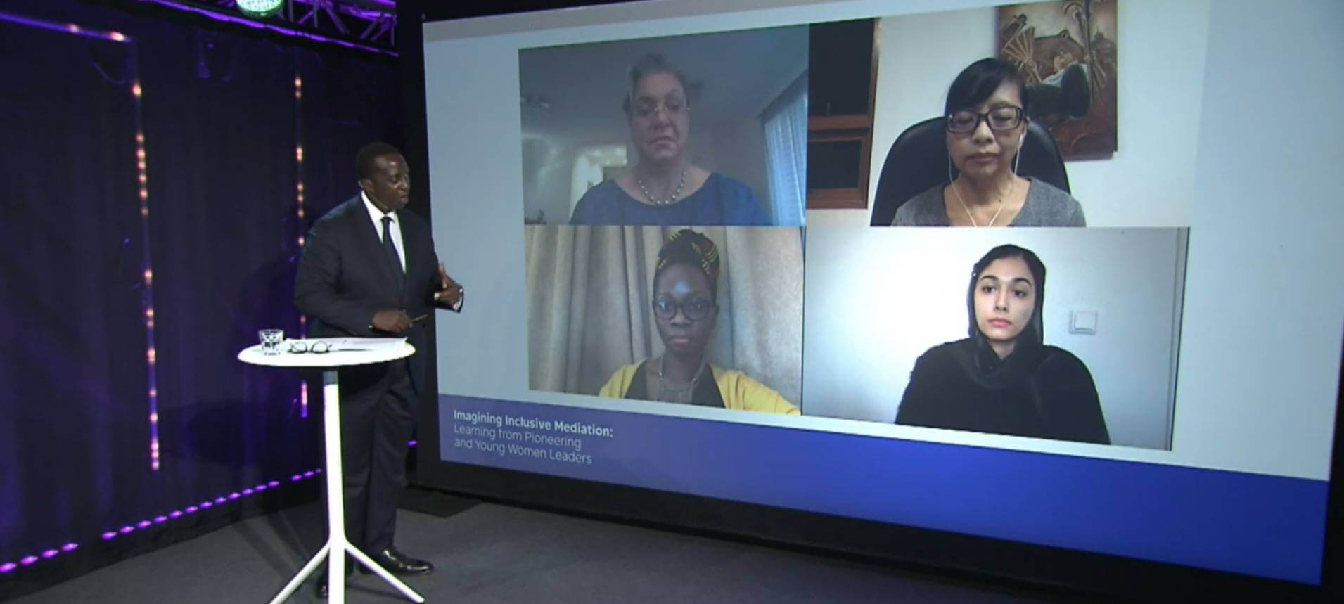 CMI’s Itonde Kakoma moderating a discussion with Hanna Tetteh, Miriam Coronel-Ferrer, Hajer Sharief and Emmily Koiti (clockwise, starting from upper left corner).