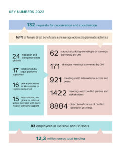 Reflecting the diminished capacity of official diplomacy to provide solutions to conflicts, the demand for CMI’s services continued to grow, reaching an all-time high in 2022, with 132 requests for support in all.